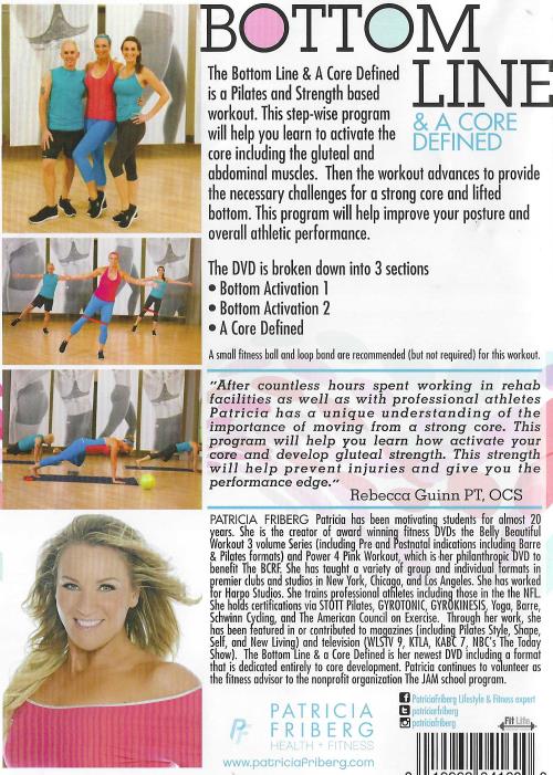 The Bottom Line & A Core Defined is a Pilates and Strength based workout. This step-wise program will help you learn to activate the core including the gluteal and abdominal muscles. Then the workout advances to provide the necessary challenges for a strong core and lifted bottom. This program will help improve your posture and overall athletic performance. The DVD is broken down into 3 sections • Bottom Activation 1 • Bottom Activation 2 • A (ore Defined LI 6( A CUR, DEFINED E A small fitness ball and loop band are recommended (but not required) for this workout. "After countless hours spent working in rehab facilities as well as with professional athletes Patricia has a unique understanding of the importance of moving from a strong core. This program will help you learn how activate your core and develop gluteal strength. This strength will help prevent injuries and give you the performance edge.