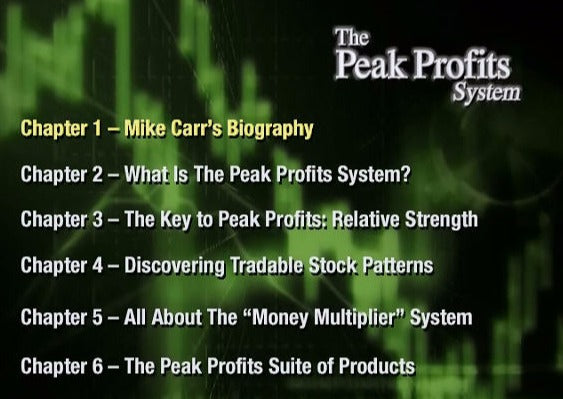 The Peak Profits System Chapter 1 — Mike Carr's Biography Chapter 2 — What Is The Peak Profits System? Chapter 3 — The Key to Peak Profits: Relative Strength Chapter 4 — Discovering Tradable Stock Patterns Chapter 5 — All About The "Money Multiplier" System Chapter 6 — The Peak Profits Suite of Products