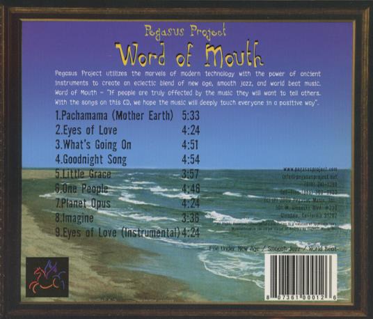 Pegasus Project utilizes the marvels of modern technology combined with ancient instruments to create an eclectic blend of new age, smooth jazz, and world beat music. Their album Word of Mouth aims to touch listeners deeply with its melodic and positive messages. The group's unique fusion of styles results in a soothing, engaging listening experience that spans cultures and genres. By blending electronic and traditional sounds, Pegasus Project creates a distinctive musical atmosphere that appeals to a broad audience.