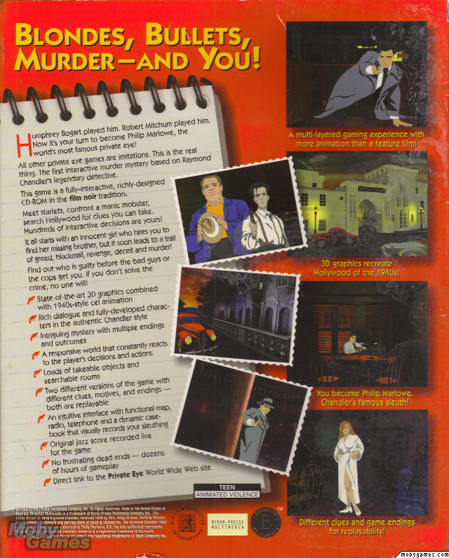 Private Eye is based on the works of the writer Raymond Chandler. It is actually more of an interactive movie than a game, which uses cel animation techniques also seen in Oni. The player gets to control the famous private eye Phillip Marlowe, who is trying to do what he does best i.e., solve a murder mystery. The game features alternate endings, voice acting, lots of cut-scenes and music faithful to the 1940's era, which the game is trying to represent.