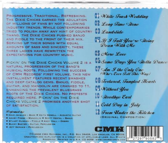 Pickin on the Dixie Chicks Volume 2 is a natural progression of the bands musical roots. Following the success of CMH Records first volume, this new installment features recent smashes and deep catalog gems. Banjo, fiddle, guitar, and mandolin are cranked to 11, enhancing the prevalent bluegrass roots of the Dixie Chicks. No protests required here. Pickin on the Dixie Chicks Volume 2 promises another shot of satisfaction.