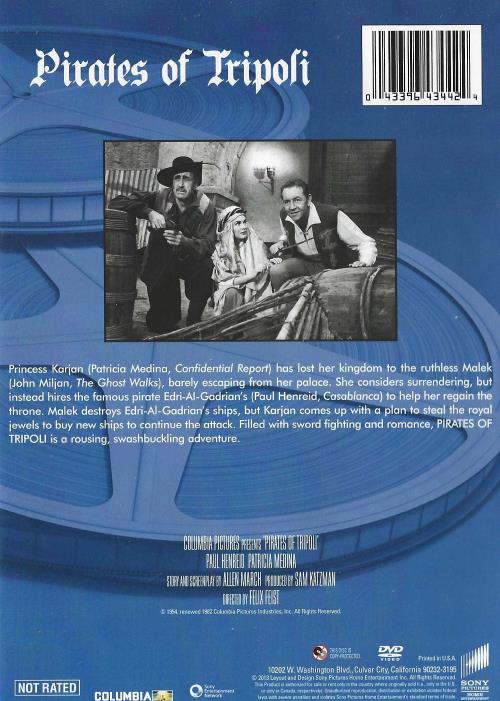 Princess Karjan (Patricia Medina, Confidential Report) has lost her kingdom to the ruthless Malek (John Miljan, The Ghost Walks), barely escaping from her palace. She considers surrendering, but instead hires the famous pirate Edri-Al-Gadrian's (Paul Henreid, Casablanca) to help her regain the throne. Malek destroys Edri-Al-Gadrian's ships, but Karjan comes up with a plan to steal the royal jewels to buy new ships to continue the attack. Filled with sword fighting and romance, PIRATES OF TRIPOLI is a rousing, swashbuckling adventure. Newly remastered.