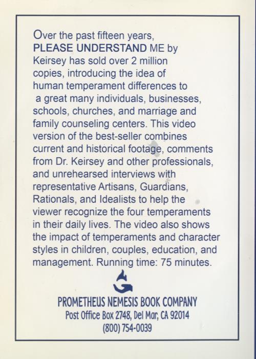 This video version of the best-seller combines current and historical footage, comments from Dr. Keirsey and other professionals, and unrehearsed interviews with representative Artisans, Guardians, Rationals, and Idealists to help the viewer recognize the four temperaments in daily lives.