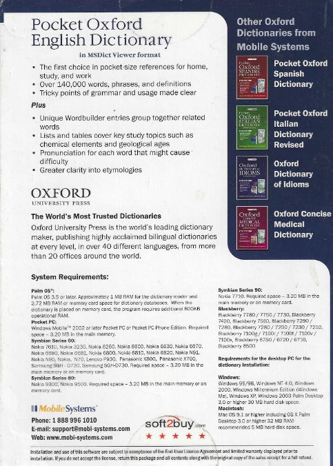 Mobile Systems Pocket Oxford English Dictionary This is a Palm OS reissue of the ninth edition of the world's longest-established pocket English dictionary by Oxford University Press. It is one of the new generation Oxford dictionaries derived from the database of the highly acclaimed New Oxford Dictionary of English and is particularly user friendly with its elegant open design, with different elements starting on new lines. It offers excellent coverage of English as an international language and thousands of examples illustrate idiomatic usage. All irregular noun, verb, and adjectival inflections are spelled out in full, while guidance on grammar and good usage is provided by in-text notes. Additional features include Wordbuilder boxes giving information on related words and thematic tables on subjects such as countries, chemical elements, and nationalities.