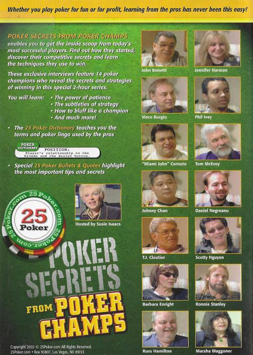 Whether you play poker for fun or for profit, learning from the pros has never been this easy! POKER SECRE P r)Icri,?P'j enables you to ge ' s most successful players. Find out how they started, discover their competitive secrets and learn the techniques they use to win. These exclusive interviews feature 14 poker champions who reveal the secrets and strategies of winning in this special 2-hour series