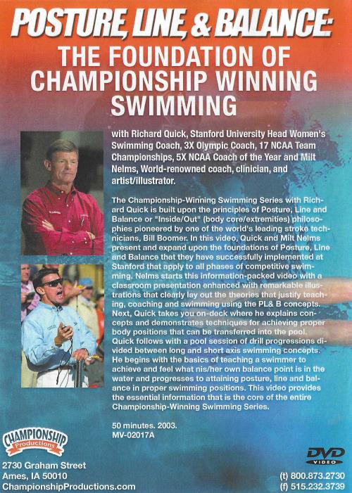 The Championship Winning Swimming Series with Richard Quick is built upon the principles of Posture, Line and Balance or "Inside/Out" (body core/extremities) philosophies pioneered by one of the world's leading stroke technicians. In this swimming DVD, Coach Quick and Milt present and expand upon the foundations of Posture, Line and Balance that they have successfully implemented and apply to all phases of competitive swimming.