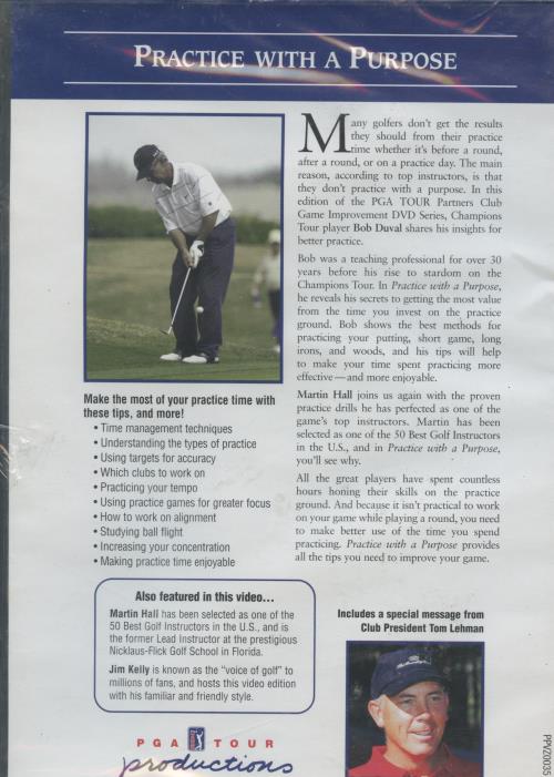 In this edition of the PGA TOUR Partners Club Game Improvement DVD Series, Champions Tour player Bob Duval shares his insights for better practice. Bob was a teaching professional for over 30 years before his rise to stardom on the Champions Tour. In Practice with a Purpose, he reveals his secrets to getting the most value from the time you invest on the practice ground. Bob shows the best methods for practicing your putting, short game, long irons, and woods, and his tips will help to make your time spent practicing more effective—and more enjoyable. Martin Hall joins us again with the proven practice drills he has perfected as one of the game's top instructors. Martin has been selected as one of the 50 Best Golf Instructors in the U.S., and in Practice with a Purpose, you'll see why. All the great players have spent countless hours honing their skills on the practice ground. And because it isn't practical to work on your game while playing a round, you need to make better use of the time you spend practicing. Practice with a Purpose provides all the tips you need to improve your game. Also featured in this video... Martin Hall has been selected as one of the 50 Best Golf Instructors in the U.S., and is the former Lead Instructor at the prestigious Nicklaus-Flick Golf School in Florida. Jim Kelly is known as the "voice of golf" to millions of fans, and hosts this video edition with his familiar and friendly style.