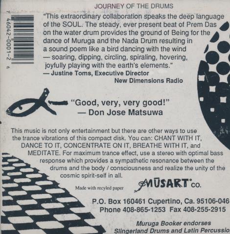 "This extraordinary collaboration speaks the deep language of the SOUL. The steady, ever present beat of Prem Das on the water drum provides the ground of Being for the dance of Muruga and the Nada Drum resulting in a sound poem like a bird dancing with the wind — soaring, dipping, circling, spiraling, hovering, joyfully playing with the earth's elements."