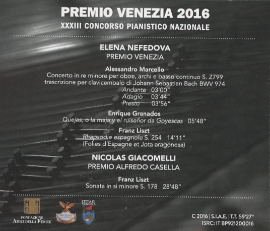 This release presents the winners of the Premio Venezia 2016 piano competition. Elena Nefedova, awarded the Premio Venezia, performs works by Alessandro Marcello, Enrique Granados and Franz Liszt in a program that highlights transcriptions and Romantic virtuosity. Nicolas Giacomelli, awarded the Premio Alfredo Casella, contributes an authoritative reading of Liszt's Sonata in B minor. The recordings capture the pianistic detail and expressive range typical of high-level national competition performances.