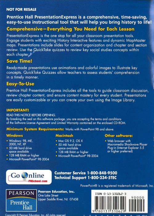 NOT FOR RESALE Prentice Hall PresentationExpress is a comprehensive, time-saving, easy-to-use instructional tool that will help you bring history to life! Comprehensive—Everything You Need for Each Lesson PresentationExpress is the one stop for all your classroom presentation tools, Engage students with exciting History Interactive features and dynamic MapMaster maps. Presentations include slides for content organization and chapter and section review. Use the QuickTake quizzes to review key social studies concepts within each chapter. Save Time! Ready-made presentations use animations and colorful images to illustrate key concepts. QuickTake Quizzes allow teachers to assess students' comprehension in a timely manner. Easy-To-Use Prentice Hall PresentationExpress includes all the tools to guide classroom discussion, review chapter content, and ensure content mastery for every student. Presentations are easily customizable or you can create your own using the Image Library. I