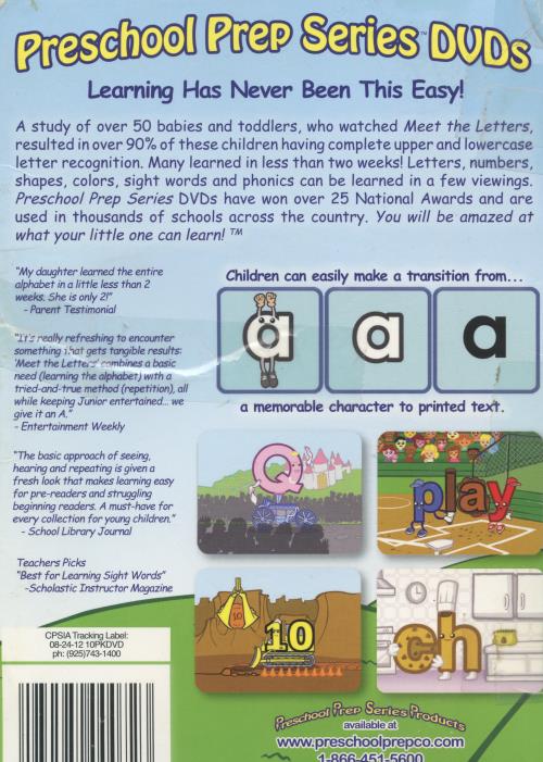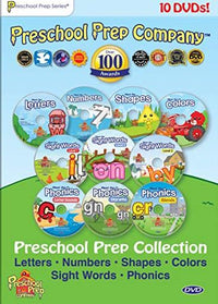 10 DVD Collection This set includes all of our award-winning DVDs in a boxed format. The collection features 'Meet the Letters', 'Numbers', 'Shapes', 'Colors', as well as 'Sight Words 1, 2 & 3', and 'Meet the Phonics - Letter Sounds, Digraphs, and Blends'. The DVDs from Preschool Prep Company have received over 25 national awards and are utilized in thousands of educational institutions nationwide.