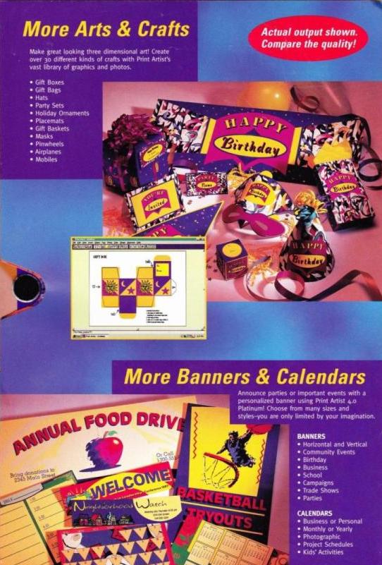 Whether you're creating a sentimental greeting card, the soccer club newsletter, an outrageous celebration banner, or a project of your own, Print Artist Platinum provides the tools you'll need for results beyond your wildest imagination. Print Artist Platinum includes over 175,000 top-quality graphics that can be resized and recolored, plus over 300 AGFA fonts, spectacular text effects, a complete color palette and even a layering tool for complete control over your project. Whatever the occasion, Print Artist Platinum has it all for your home publishing needs!
