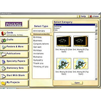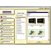 On the left of the screen is a category list with three other windows. The first window shows project types within the category. The second window shows styles such as business, home, or party. The third and largest window shows thumbnails of the templates of the type you've selected. Project types include cards, crafts, posters, newsletters, banners--in fact, just about every paper-based printed item you can imagine. There are even templates for stationery sets suitable for business or home use--a total of 8,000 templates. And you can create and send ecards--including animated ones.