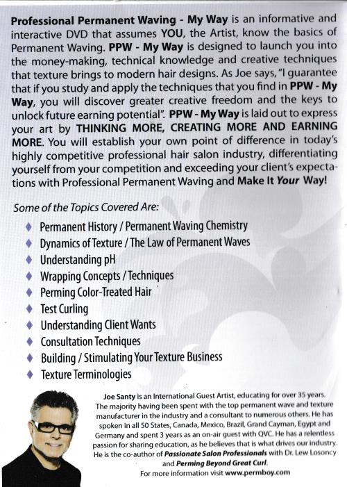 Professional Permanent Waving - My Way is an informative and interactive DVD that assumes YOU, the Artist, know the basics of Permanent Waving. PPW - My Way is designed to launch you into the money-making, technical knowledge and creative techniques that texture brings to modern hair designs. As Joe says, "1 guarantee that if you study and apply the techniques that you find in PPW - My Way, you will discover greater creative freedom and the keys to unlock future earning potential". PPW - My Way is laid out to express your art by THINKING MORE, CREATING MORE AND EARNING MORE. You will establish your own point of difference in today's highly competitive professional hair salon industry, differentiating yourself from your competition and exceeding your client's exper to tions with Professional Permanent Waving and Make It Your Way! Some of the Topics Covered Are: Permanent History / Permanent Waving Chemistry Dynamics of Texture /The Law of Permanent Waves ♦ Understanding pH ♦ Wrapping Concepts /Techniques ♦ Perming Color-Treated Hair ♦ Test Curling ♦ Understanding Client Wants ♦ Consultation Techniques ♦ Building / Stimulating Your Texture Business ♦ Texture Terminologies