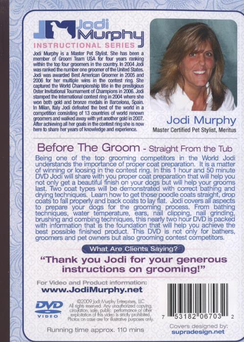 Before The Groom - Straight From the Tub Being one of the top grooming competitors in the World Jodi understands the importance of proper coat preparation. It is a matter of winning or loosing in the contest ring. In this 1 hour and 50 minute DVD Jodi will share withyou proper coat preparation that will help you not only get a beautiful finish on your dogs but will help your grooms last. Two coat types will be demonstrated with correct bathing and drying techniques. Learn how to get those poodle coats straight, drop coats to fall properly and back coats to lay flat. Jodi covers all aspects to prepare your dogs for the grooming process. From bathing techniques, water temperature, ears, nail clipping, nail . grinding, brushing and combing techniques, this nearly two hour DVD is packed with information that is the foundation that will help you achieve the best possible finished product. This DVD is not only for bathers. groomers and pet owners but also grooming contest competitors.