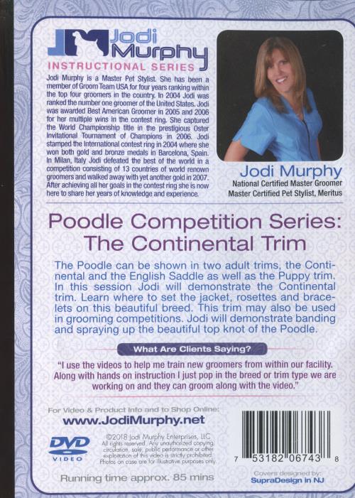 Poodle Competition Series: The Continental Trim The Poodle can be shown in two adult trims, the Conti-nental and the English Saddle as well as the Puppy trim. In this session Jodi will demonstrate the Continental trim. Learn where to set the jacket, rosettes and brace-lets on this beautiful breed. This trim may also be used in grooming competitions. Jodi will demonstrate banding and spraying up the beautiful top knot of the Poodle.