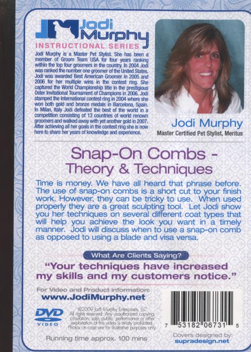 Snap-On Combs -Theory & Techniques Time is money. We have all heard that phrase before. The use of snap-on combs is a short cut to your finish work. However, they can be tricky to use. When used properly they are a great sculpting tool. Let Jodi show you her techniques on several different coat types that will help you achieve the look you want in a timely manner. Jodi will discuss when to use a snap-on comb as opposed to using a blade and visa versa. "Your techniques have increased my skills and my customers notice."