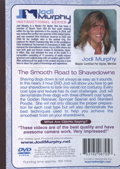 PROFESSIONAL PET STYLIST: SMOOTH ROAD TO SHAVEDOWNS VOL. 5 The Smooth Road to Shavedowns Shaving dogs down is not always as easy as it sounds. In this nearly 3 hour DVD Jodi will show you how to get your shavedowns to look like velvet not corduroy. Every coat type and texture has its own challenges. Jodi will demonstrate three dogs with three different coat types, the Golden Retriever, Springer Spaniel and Standard Poodle. She will not only discuss the proper prepara-tion for each coat type but will also demonstrate the best techniques used to help you achieve the smoothest finish on your shavedowns.