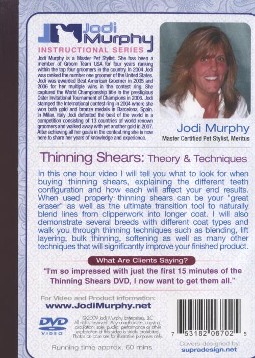 Thinning Shears: Theory & Techniques Jodi Murphy Master Certified Pet Stylist, Meritus Thinning Shears: Theory & Techniques In this one hour video I will tell you what to look for when buying thinning shears, explaining the different teeth configuration and how each will affect your end results. When used properly thinning shears can be your "great eraser" as well as the ultimate transition tool to naturally blend lines from clipperwork into longer coat. I will also demonstrate several breeds with different coat types and walk you through thinning techniques such as blending, lift layering, bulk thinning, softening as well as many other techniques that will significantly improve your finished product.