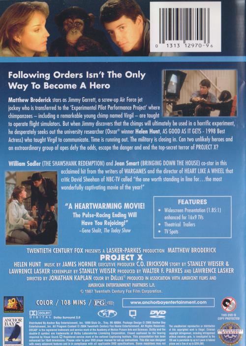 Project X DVD VIDEO MOVIE 1987 Matthew Broderick Helen Hunt air force chimpanzee