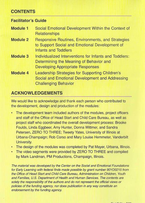 CONTENTS Facilitator's Guide Module 1 Module 2 Module 3 Module 4 Social Emotional Development Within the Context of Relationships Responsive Routines, Environments, and Strategies to Support Social and Emotional Development of Infants and Toddlers Individualized Interventions for Infants and Toddlers: Determining the Meaning of Behavior and Developing Appropriate Responses Leadership Strategies for Supporting Children's Social and Emotional Development and Addressing Challenging Behavior