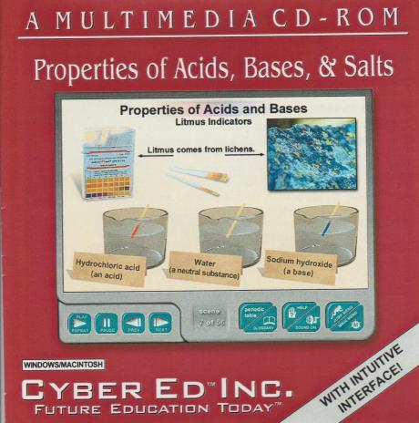 A MULTIMEDIA CD-ROM Properties of Acids, Bases, & Salts. Designed for classroom and individual use, this interactive educational program includes: PRESENTATION with automatic/manual user control, includes integrated animations, custom graphics, 3D representations. photographs, and sound JUMP PRESENTATION outline menu for specific subject location in the presentation INTERACTIVE LESSONS for reinforcement of subject material PRE and POST TESTING before and after using program. Online features not guaranteed to still work.