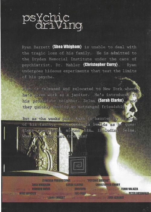 Psychic Driving based on actual accounts of government funded mind control experimentsNo recognized text !Psychic Driving a short film by john albanis Ryan Barrett {Shea Whigham) is unable to deal with the tragic loss of his family. He is admitted to the Dryden Memorial Institute under the care of psychiatrist, Dr. Mahler {Christopher Curry). Ryan undergoes hideous experiments that test the limits of his psyche. is released and relocated to New York wher riven work as a janitor. He's introduced to tote neighbor, Selma {Sarah Clarke), velop an estranged friendshi his pr they auidkly But as the weeks Ryan is haunted L of his' family.