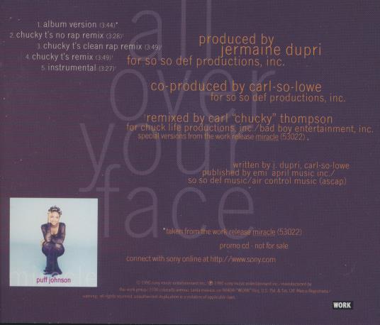 Puff Johnson: All Over Your Face 5-Track PROMO MUSIC AUDIO CD R&B remixes 1996