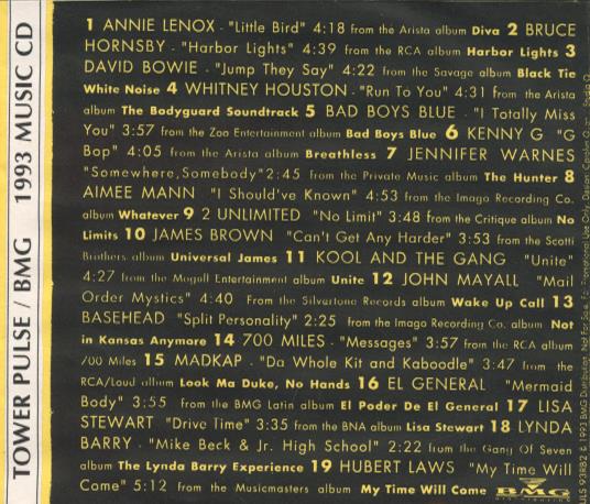 This limited edition sampler CD includes tracks from several notable albums such as Annie Lennox's "Diva," Bruce Hornsby's "Harbor Lights," David Bowie's "Black Tie White Noise," and others. It features exclusive selections like Whitney Houston's "Run To You" from The Bodyguard soundtrack, alongside hits from James Brown, Kool and the Gang, and more.