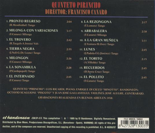Recordings made in Buenos Aires in 1938. Compilation © & ℗ 1998 by El Bandoneon. Digitally remastered. Distributed by Blue Moon Producciones Discográficas, S.L. (Barcelona - Spain). File under: Tango.