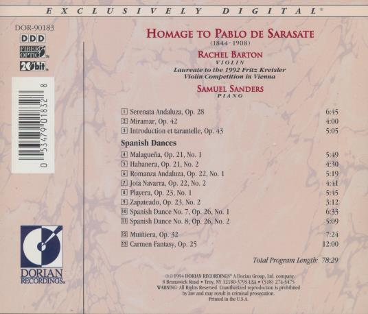 Rachel Barton / Samuel Sanders: Homage To Pablo De Sarasate MUSIC AUDIO CD 1994