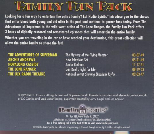 Radio Spirits is known for producing nostalgic audio collections of classic radio shows that entertain audiences. Looking for a fun way to entertain the entire family? Let Radio Spirits introduce you to the shows that entertained both young and old alike in the past and continue to garner fans today. From The Adventures of Superman to the wild west action of The Lone Ranger, the Family Fun Pack offers 3 hours of digitally restored and remastered episodes that will entertain the entire family. Whether you are traveling in the car or have reached your destination, allow the entire family to share the fun!