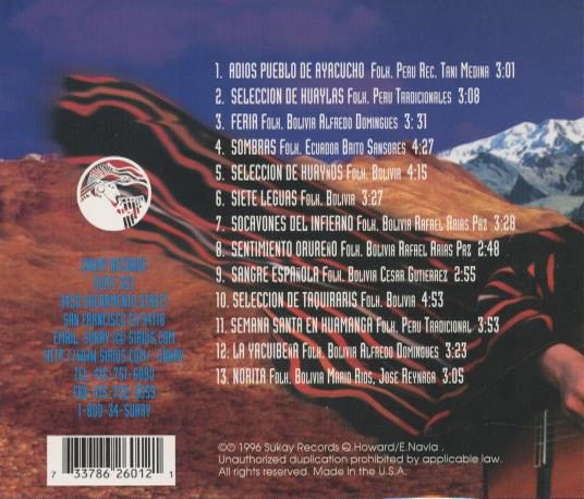 Rafael Arias performs intimate, instrumental interpretations of traditional Andean and South American folk melodies on classical guitar. His arrangements highlight the lyrical and rhythmic qualities of Andean music while keeping the pieces accessible to new listeners. The album showcases repertoire from Peru, Bolivia and Ecuador, presented in warm acoustic guitar settings. These recordings emphasize melody and traditional forms with tasteful, modern guitar accompaniment.