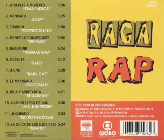 Raga Rap is a Latin compilation album that blends ragga, reggae and hip-hop influences across a variety of artists. Released by Globo Records, the collection highlights dancehall-tinged tracks, reggaefunk grooves and Spanish-language rap performances. Contributors include Franshesca, Proyecto Uno, Reggae Sam, Kid Power Posse and others, offering a diverse mix of MCs and vocalists. The overall sound emphasizes bass-driven rhythms, offbeat reggae patterns and energetic rap deliveries.