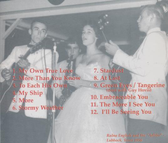 Ralna English performs a collection of classic love songs and standards. These recordings capture a warm 1950s vocal style backed by a small combo credited as "Adlibs". The material ranges from torch ballads to upbeat standards delivered with clear phrasing and traditional pop arrangements. This release highlights early live performances recorded in Lubbock, Texas.