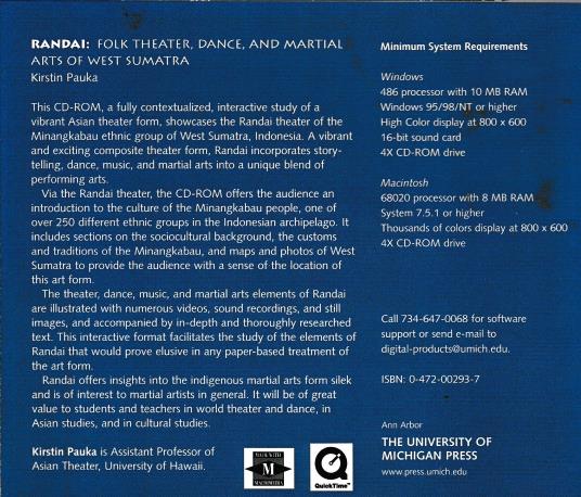 RANDAI FOLK THEATER, DANCE, AND MARTIAL ARTS OF WEST SUMATRA .S111.0, Kirstin Pauka RANDAI: FOLK THEATER, DANCE, AND MARTIAL ARTS OF WEST SUMATRA Kirstin Pauka This CD-ROM, a fully contextualized, interactive study of a vibrant Asian theater form, showcases the Randai theater of the Minangkabau ethnic group of West Sumatra, Indonesia. A vibrant and exciting composite theater form, Randal incorporates story-telling, dance, music, and martial arts into a unique blend of performing arts. Via the Randai theater, the CD-ROM offers the audience an introduction to the culture of the Minangkabau people, one of over 250 different ethnic groups in the Indonesian archipelago. It includes sections on the sociocultural background, the customs and traditions of the Minangkabau, and maps and photos of West Sumatra to provide the audience with a sense of the location of this art form. The theater, dance, music, and martial arts elements of Randai are illustrated with numerous videos, sound recordings, and still images, and accompanied by in-depth and thoroughly researched text. This interactive format facilitates the study of the elements of Randai that would prove elusive in any paper-based treatment of the art form. Randal offers insights into the indigenous martial arts form silek and is of interest to martial artists in general. It will be of great value to students and teachers in world theater and dance, in Asian studies, and in cultural studies. Kirstin Pauka is Assistant Professor of Asian Theater, University of Hawaii.