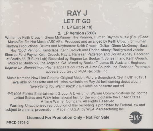 Ray J is an American R&B singer featured here on the 1996 single "Let It Go". The release blends smooth contemporary R&B vocals with mid-tempo grooves and layered background harmonies. This single appears on the New Line Cinema soundtrack "Set It Off" and is also noted as appearing on Ray J's forthcoming debut album "Everything You Want". Production and arrangements on the track are by Keith Crouch, giving the song a polished 1990s R&B sound.