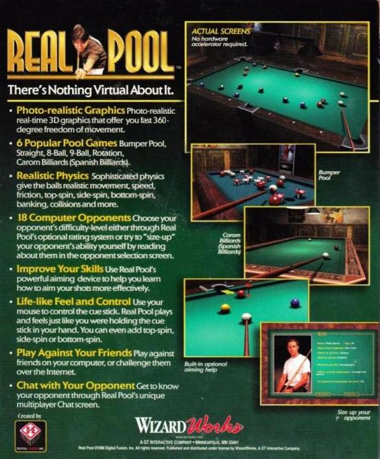 There's Nothing Virtual About It! From the first look at the screen, you can tell you're playing the most realistic pool game ever. But, the screen is just the beginning. Everything about Real Pool is more realistic. The feel of the game. The physics. Sizing up your opponent, chatting with your opponent, and much more. 3D billiards game features a mouse-driven play metaphor and six pool games: Bumper Pool, Straight Pool, 8-Ball, 9-Ball, Rotation and Carom Billiards (Spanish Billiards).
