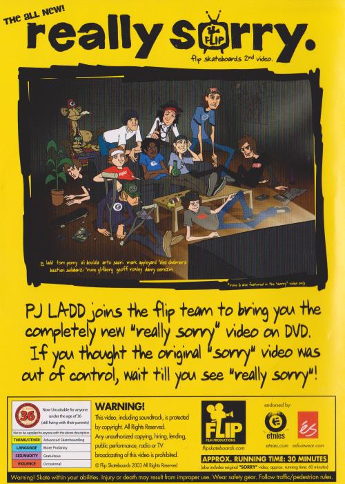 PJ LADD joins the flip team to bring you a completely new "really sorry" video on DVD. If you thought the original "sorry" video was out of conttrrol, wait till you see "really sorry"!