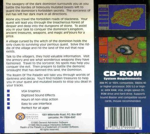 Realm of the Paladin is a top-down RPG created by Cavalier Software and published by Micro League. The savagery of the dark dominion surrounds you as you battle the hordes of hideously mutated beasts left to guard the dominion's forbidden secrets. Your quest will lead you through the treacherous forest of desire and deep into the dungeons of stone. The Realm of the Paladin will take you through world's of darkness and decay. You'll find hidden treasures to help you in your quest and mutated breasts to stop you dead in your tracks.