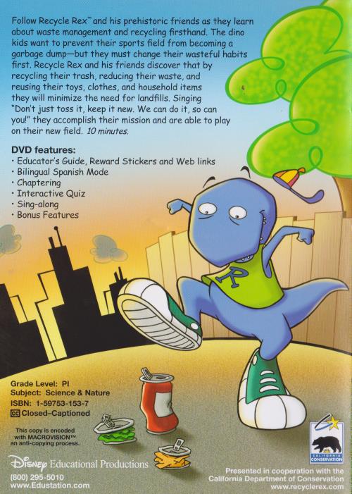 Recycle Rex Follow Recycle Rex-and his prehistoric friends as they learn about waste management and recycling firsthand. The dino ' kids want to prevent their sports field from becoming a garbage dump—but they must change their wasteful habits first. Recycle Rex and his friends discover that by recycling their trash, reducing their waste, and reusing their toys, clothes, and household items they will minimize the need for landfills. Singing "Don't just toss it, keep it new. We can do it, so can you!" they accomplish their mission and are able to play on their new field.