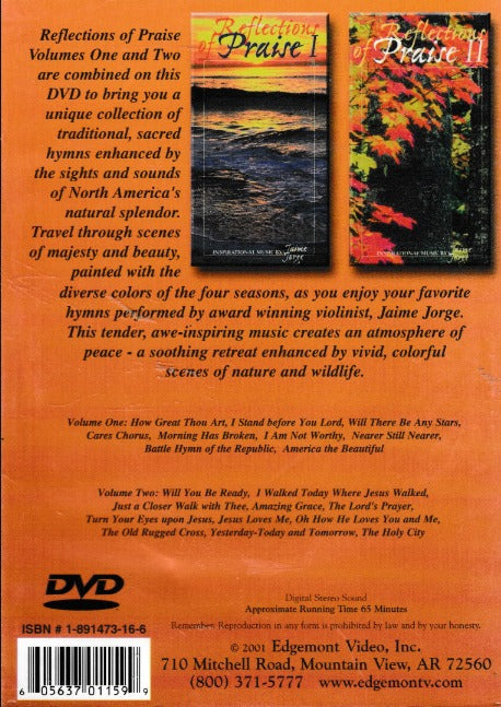 Reflections of Praise Volumes One and Two are combined on this DVD to bring you a unique collection of traditional, sacred hymns enhanced by the sights and sounds of North America's natural splendor. Travel through scenes of majesty and beauty, painted with the diverse colors of the four seasons, as you enjoy your favorite hymns performed by award-winning violinist, Jaime Jorge. This tender, awe-inspiring music creates an atmosphere of peace - a soothing retreat enhanced by vivid, colorful scenes of nature and wildlife.