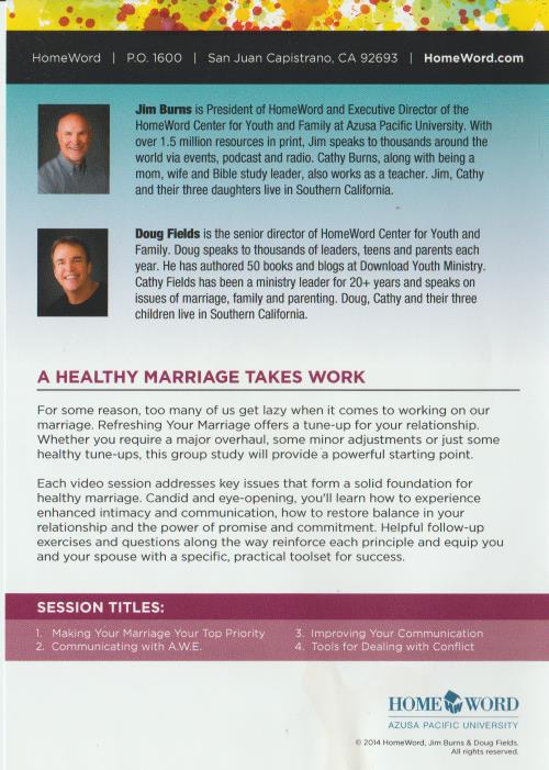 A HEALTHY MARRIAGE TAKES WORK For some reason, too many of us get lazy when it comes to working on our marriage. Refreshing Your Marriage offers a tune-up for your relationship. Whether you require a major overhaul, some minor adjustments or just some healthy tune-ups, this group study will provide a powerful starting point. Each video session addresses key issues that form a solid foundation for healthy marriage. Candid and eye-opening, you'll learn how to experience enhanced intimacy and communication, how to restore balance in your relationship and the power of promise and commitment. Helpful follow-up exercises and questions along the way reinforce each principle and equip you and your spouse with a specific, practical toolset for success. SESSION TITLES: 1. Making Your Marriage Your Top Priority 3. Improving Your Communication 2. Communicating with A.W.E. 4. Tools for Dealing with Conflict