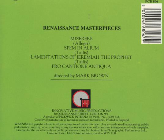 Thomas Tallis / Gregorio Allegri / Pro Cantione Antiqua, Mark Brown: Renaissance Masterpieces