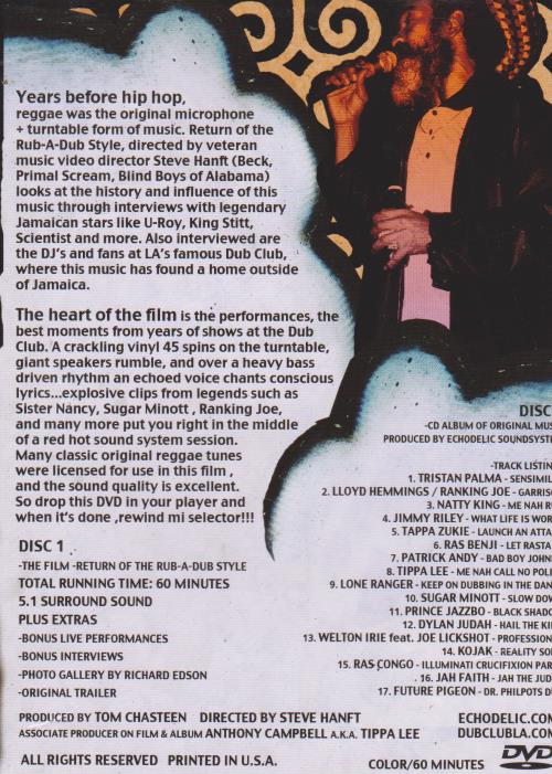 Years before hip hop, reggae was the original microphone + turntable form of music. Return of the Rub-A-Dub Style, directed by veteran music video director Steve Hanft (Beck, Primal Scream, Blind Boys of Alabama) looks at the history and influence of this music through interviews with legendary Jamaican stars like U-Roy, King Stitt, Scientist and more. Also interviewed are the DJ's and fans at LA's famous Dub Club, where this music has found a home outside of Jamaica. The heart of the film is the performances, the best moments from years of shows at the Dub Club. A crackling vinyl 45 spins on the turntable, giant speakers rumble, and over a heavy bass driven rhythm an echoed voice chants conscious lyrics... explosive clips from legends such as Sister Nancy, Sugar Minott , Ranking Joe, and many more put you right in the middle of a red hot sound system session. Many classic original reggae tunes were licensed for use in this film , and the sound quality is excellent. So drop this DVD in your player and when it's done ,rewind mi selector!!!
