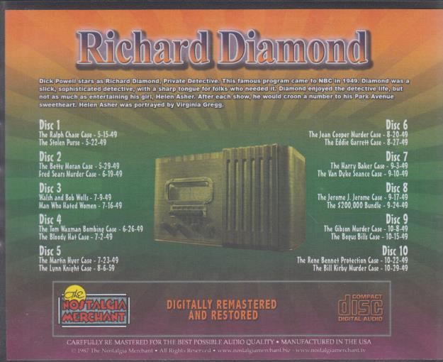 Dick Powell stars as Richard Diamond, Private Detective. This famous program came to NBC in 1949. Diamond was a slick, sophisticated detective, with a sharp tongue for folks who needed it. Diamond enjoyed the detective life, but not as much as entertaining his girl, Helen Asher. After each show, he would croon a number to his Park Avenue sweetheart. Helen Asher was portrayed by Virginia Gregg.