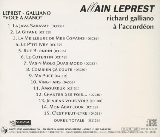 RICHARD GALLIANO: ALLAIN LEPREST: LEPREST-GALLIANO "VOCE A MANO" W/ OBI STRIP (JAPAN PRESSING)