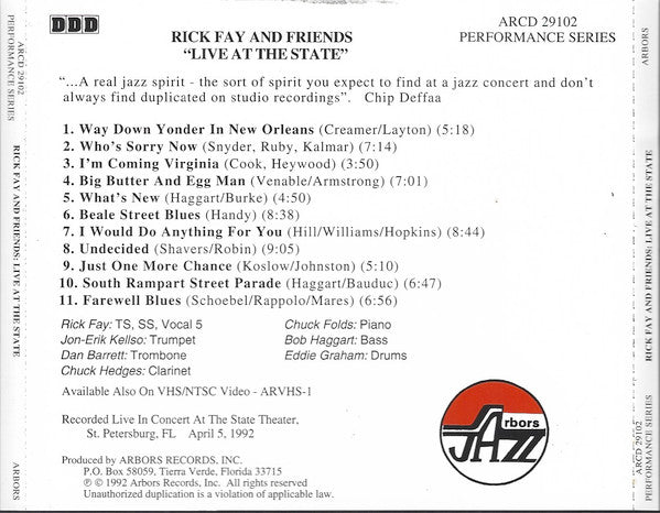 Rick Fay & Friends: Live At The State MUSIC AUDIO CD dixieland swing jazz! 1992