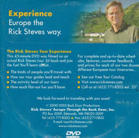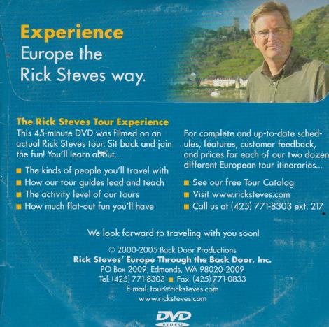 This 45-minute DVD was filmed on an actual Rick Steves tour. Sit back and join the fun! You'll learn about The kinds of people you'll travel with How our tour guides lead and teach • The activity level of our tours • How much flat-out fun you'll have For complete and up-to-date sched-ules, features, customer feedback, and prices for each of our two dozen different European tour itineraries...