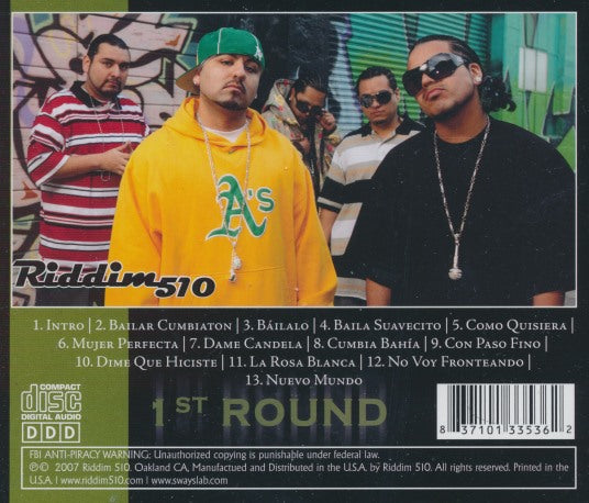 Riddim 510 is a Bay Area collective based in Oakland, CA that brings together artists rooted in Latin and urban sounds. This compilation, 1st Round, showcases contemporary cumbia, cumbiaton and Latin urban stylings with a street-level production aesthetic. The tracks blend traditional cumbia rhythms with modern beats and rap-influenced vocal delivery. The release highlights regional artists and the lively crossover of Latin dance music and urban culture.